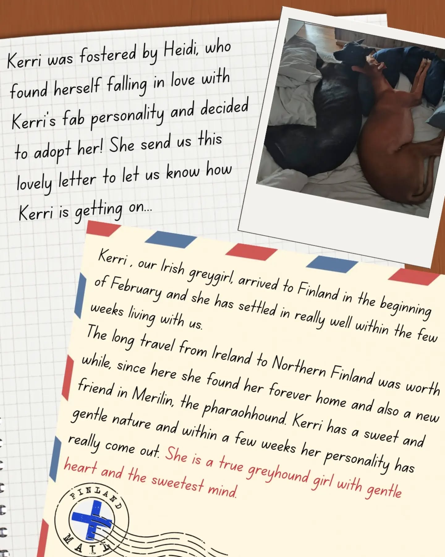 Kotihoidossa olevista greyhoundeista löydät lisätietoa Instagramista: Merilinsgreyguests